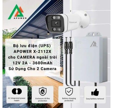 • DỰ PHÒNG AN TOÀN: Bộ lưu điện APOWER X-2112X 12V 2A, pin 3600mAh, duy trì hoạt động liên tục đến 7 giờ cho 2 camera.